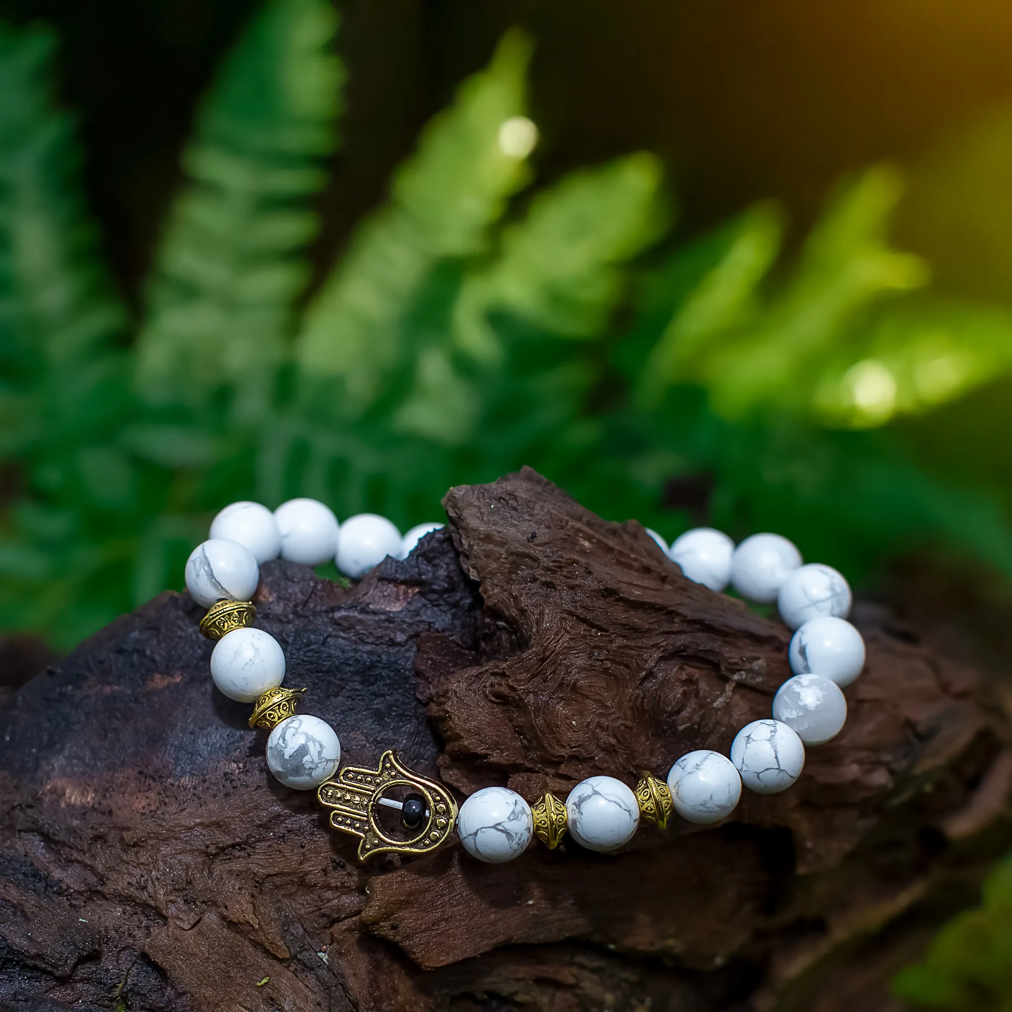 Käevõru keskmes on kuldne Hamsa sümbol – kaitse ja tasakaalu märk, mis lisab ehtele sügavama tähenduse.